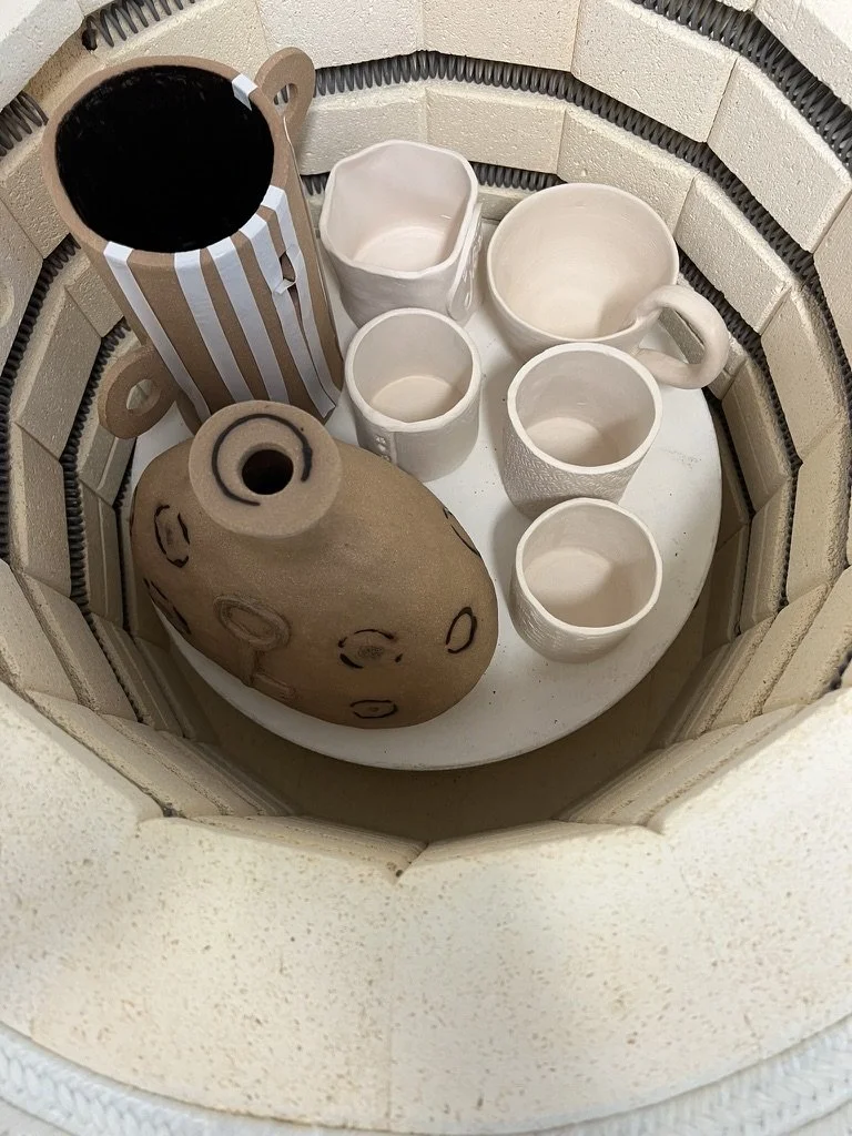 Dans notre atelier, nous utilisons du grès (pyrité ou non selon votre choix) qui subit une première cuisson à 980° (cuisson biscuit) puis une seconde cuisson à 1240° après avoir été décoré aux couleurs à peindre.